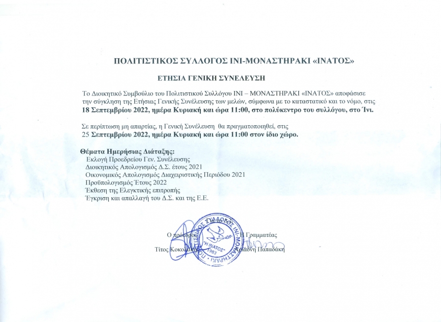 ΕΤΗΣΙΑ ΑΠΟΛΟΓΙΣΤΙΚΗ ΓΕΝΙΚΗ ΣΥΝΕΛΕΥΣΗ ΤΟΥ ΣΥΛΛΟΓΟΥ ΜΑΣ